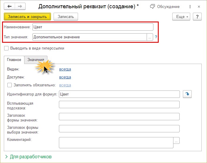 - Создайте название дополнительного реквизита, к примеру - «Цвет».