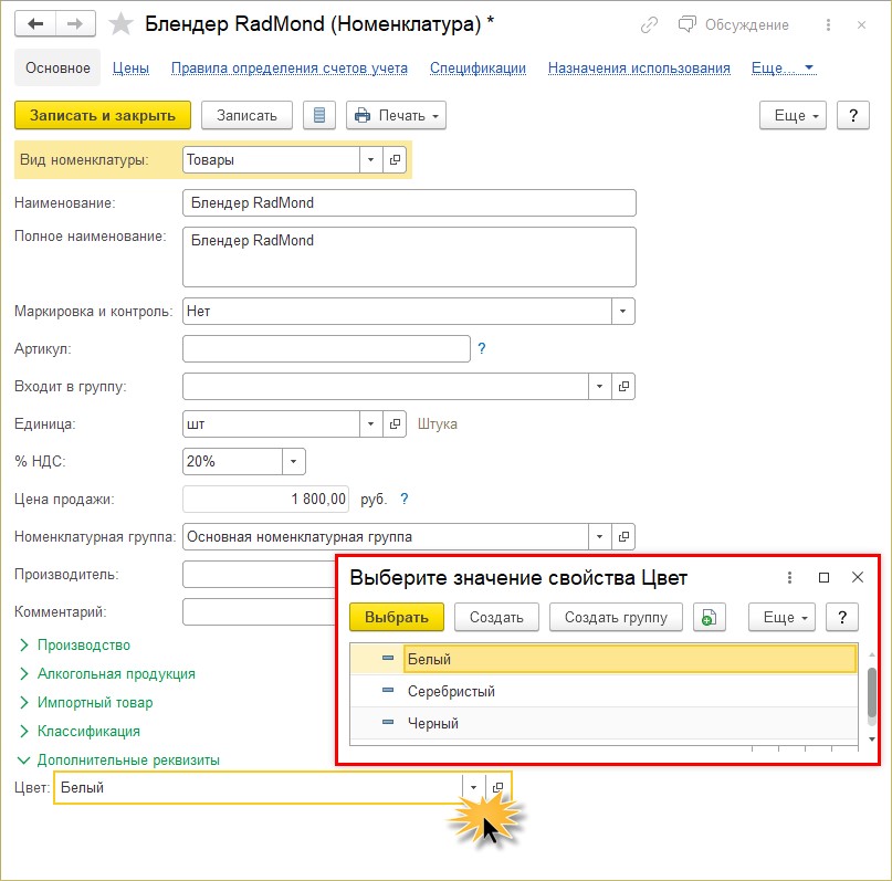 - Выполните открытие карточки элемента номенклатуры. Раздел «Дополнительные реквизиты» имеет новую графу «Цвет» с правом выбора нужного варианта из справочника.