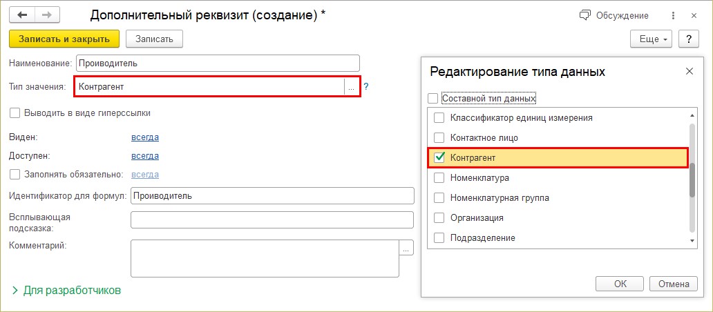 - Выберете «Тип значения» – «Контрагент» для данного реквизита.