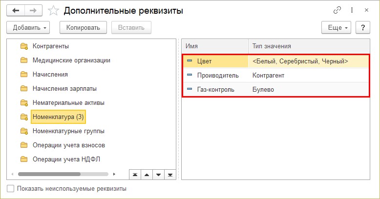 Таким образом, мы добавили 3 дополнительных реквизита для номенклатуры.