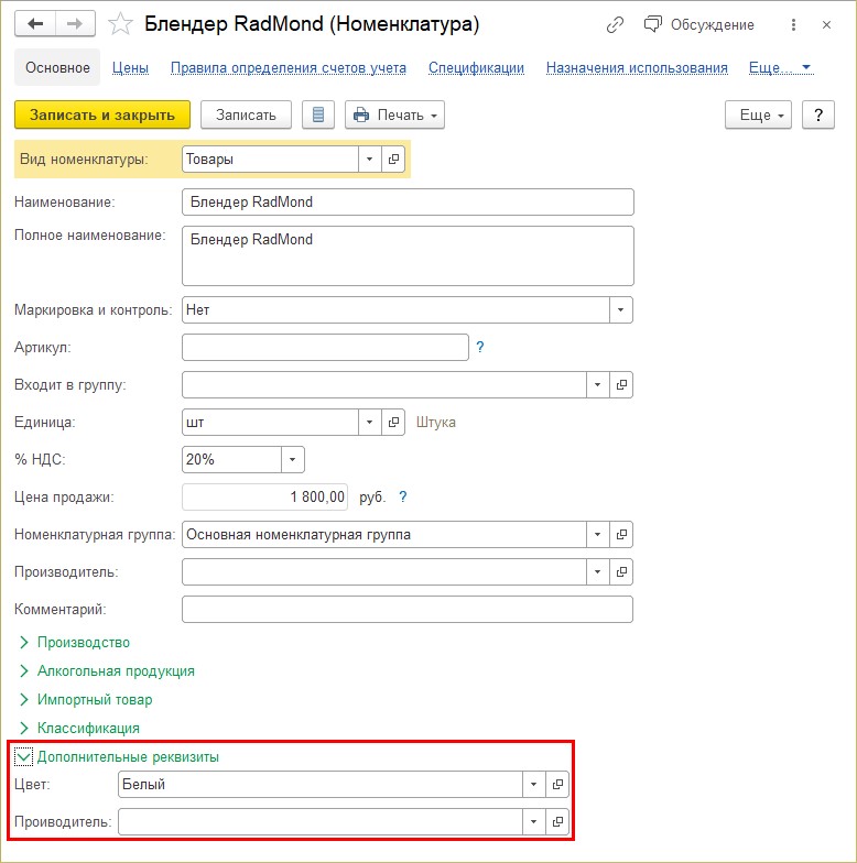 Для блендера в меню «Дополнительные реквизиты» отображены лишь: «Цвет» и «Производитель».