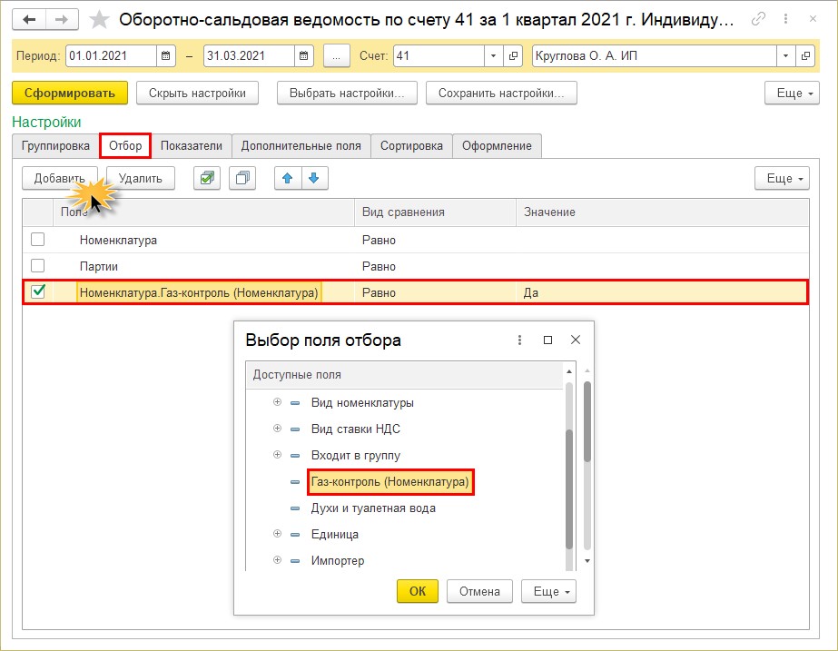 - Создайте «Оборотно-сальдовую ведомость по счету» - 41 «Товары». Меню настроек отчета во вкладке «Отбор» дополните условием отбора «Газ-контроль (Номенклатура)» - Равно. Затем выберете необходимое значение.