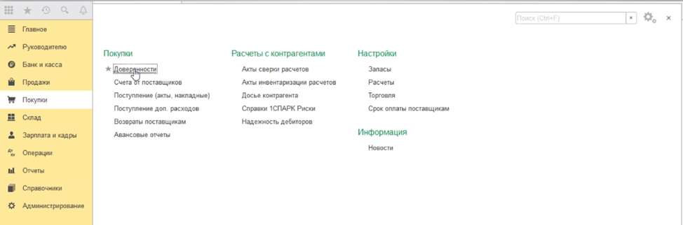 Для формирования доверенности необходимо перейти в раздел покупки, доверенности.