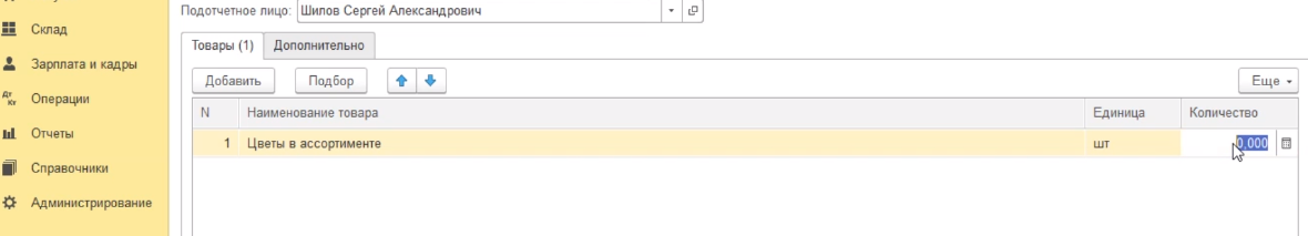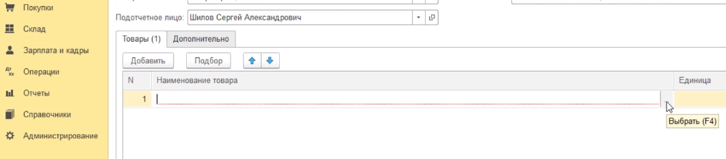 Далее подотчетное лицо. Таким же образом через выбрать и списка показать все.