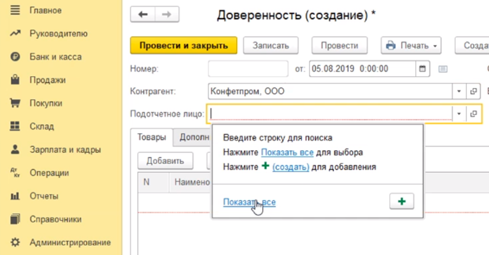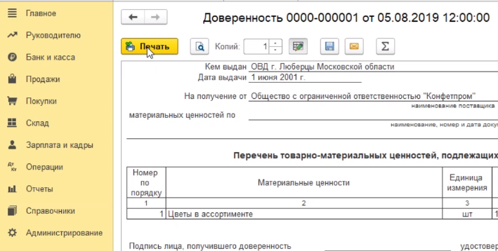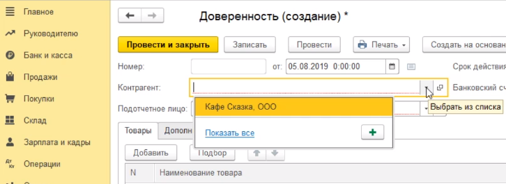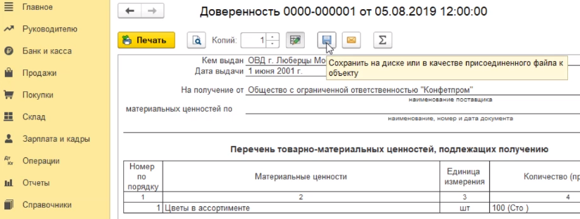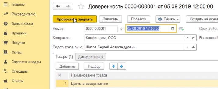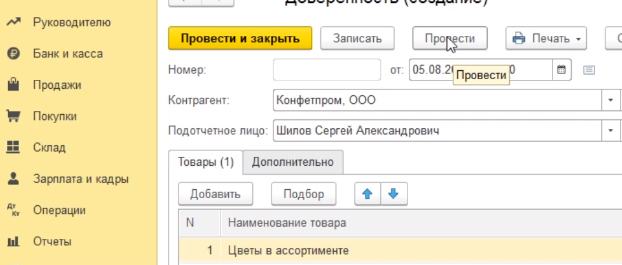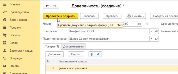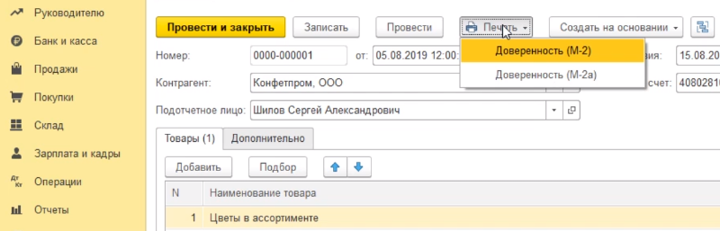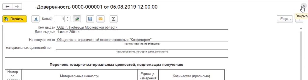 Если после формирования доверенности мы с этим документом ничего делать не будем, то мы можем воспользоваться кнопкой провести и закрыть. Документ будет проведен, и форма будет закрыта.