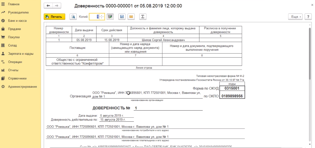 Банковский счет программа-документ подставила по умолчанию. Именно тот счет, который мы ранее указали, как основной банковской счет организации. Срок действия доверенности программа посчитала и заполнила сама автоматически.