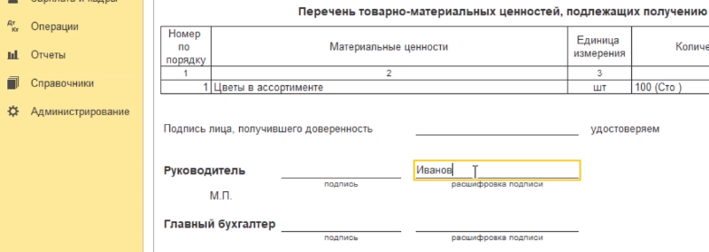 Если необходимо дозаполнить какие-либо поля доверенности, которые программа не заполнила сама, мы можем воспользоваться встроенной возможностью редактирования полей в документе. То есть выбираем поле, которое мы хотим заполнить, кликаем по нему дважды курсором и набираем текст, который мы хотим ввести в этот документ. Например, руководитель Иванов.