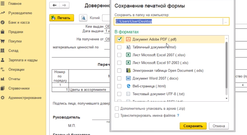 Программа предлагает выбрать из существующих и доступных форматов тот формат, в котором мы хотим сохранять документ. В нашем случае выбран pdf формат.