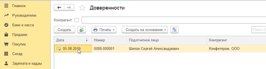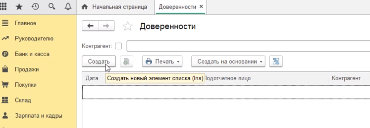 В журнале доверенности для создания нового элемента нажимаем кнопку создать.