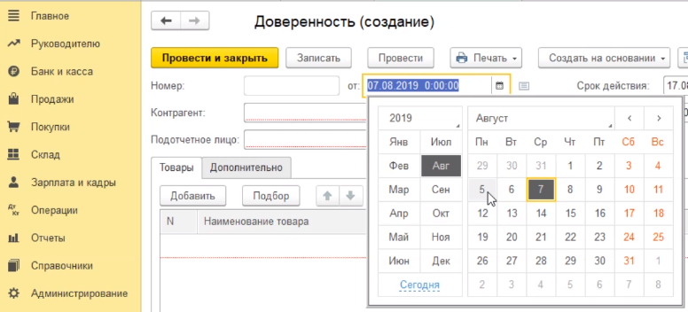 Открывается форма доверенности. Заполняем реквизиты документа. По умолчанию программа подставляет в качестве даты - текущую дату компьютера. Если необходимо эту дату изменить, то можно воспользоваться встроенным календариком и выбираем ту дату, которая должна быть у документа. В нашем случае поменяли на пятое августа.
