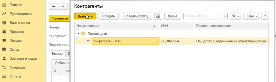 Далее находим поставщика на которого выписывается эта доверенность (ООО" Конфетпром") и нажимаем выбрать.