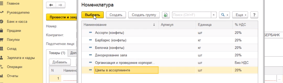 Открывается справочник номенклатуры, и мы выбираем ту номенклатуру, на которую выписывается доверенность. В нашем случае цветы в ассортименте. Нажимаем добавить.