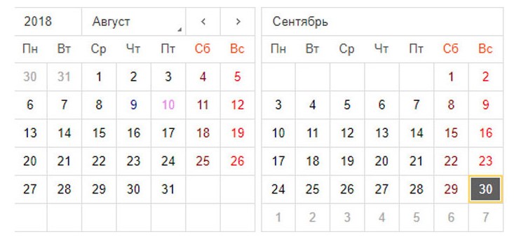 • Праздничные дни - розовый;