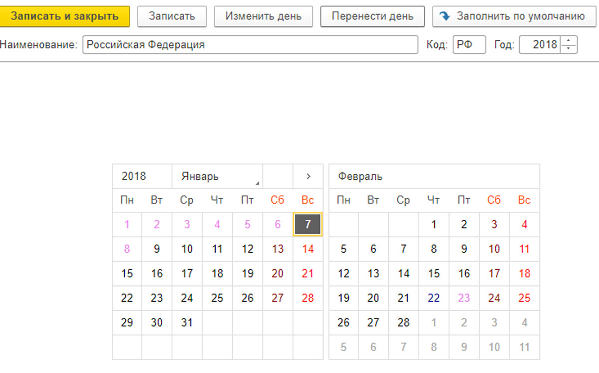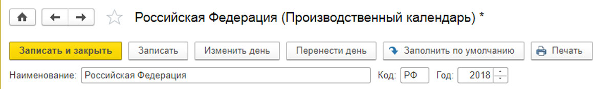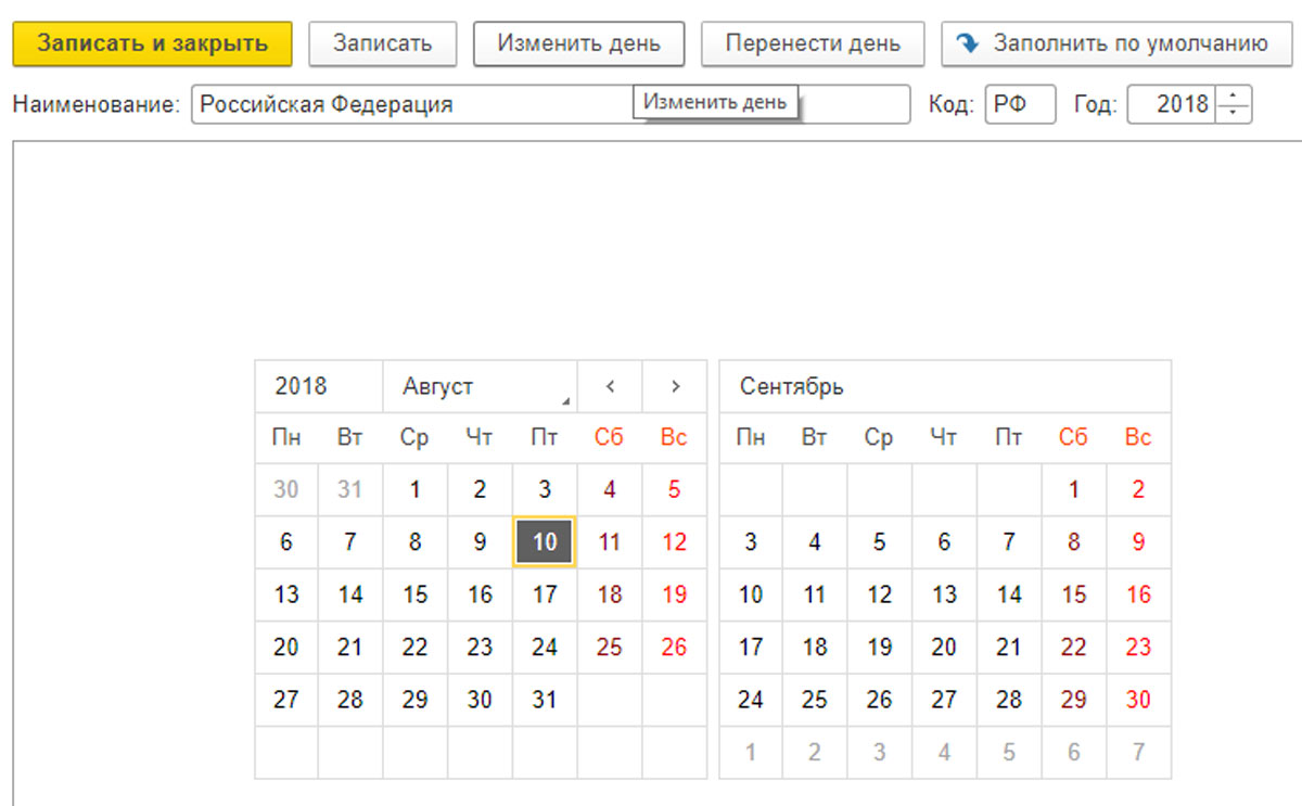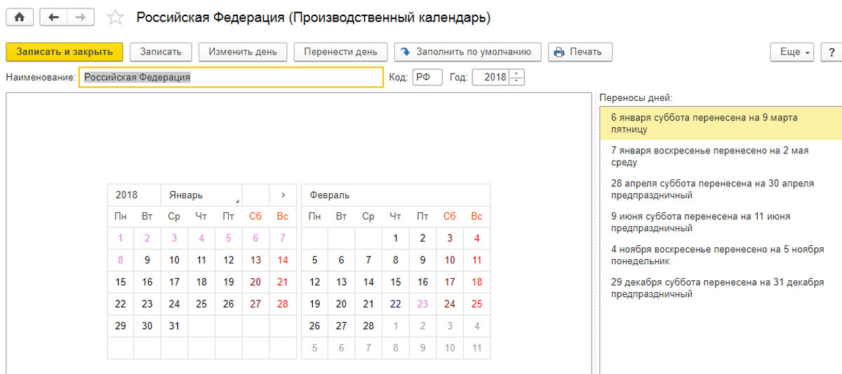Календарь следует заполнить с помощью опции «Заполнить по умолчанию», а затем настроить, нажав «Изменить день» и «Перенести день». Заполните все поля праздников и предпраздничных дней, а также перенос праздников. Затем нажмите «Записать» или «Записать и закрыть».