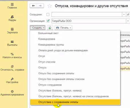 Для регистрации дня диспансеризации в программе 1С:Зарплата и управление персоналом 8, в третьей редакции, следует зайти в меню кадры, все отсутствия сотрудников