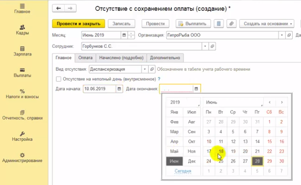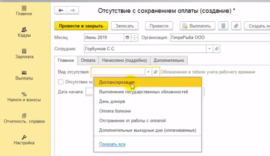 Для выбранного сотрудника указать вид отсутствия – диспансеризация