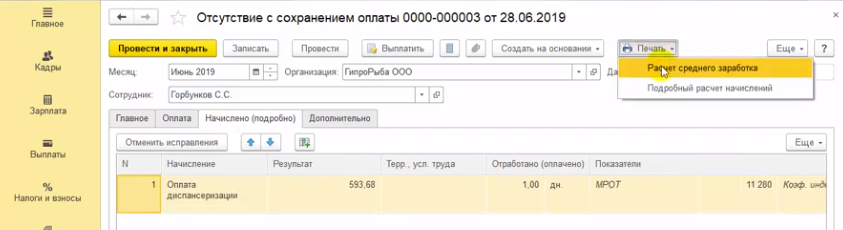 Из документа можно распечатать отчет и расчет среднего заработка, а также подробный расчет начисления