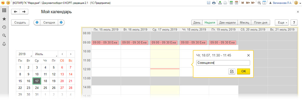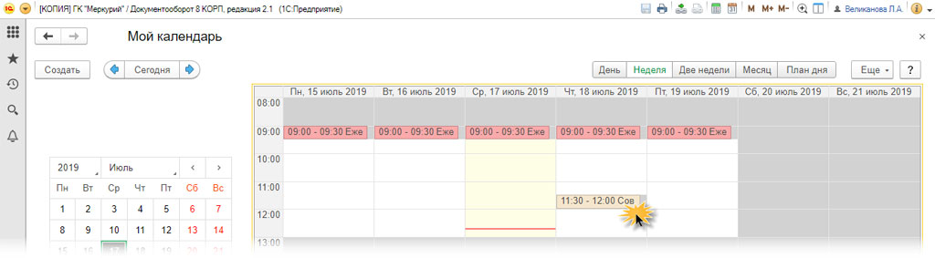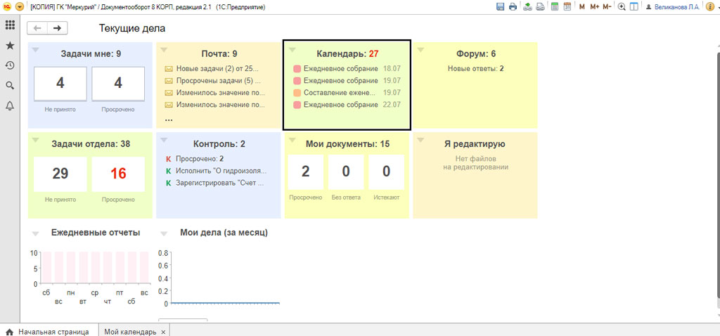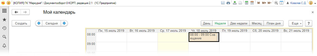 Для контроля времени пользователей в программе «1С:Документооборот» имеется функция календаря.