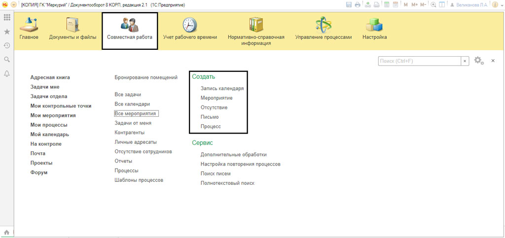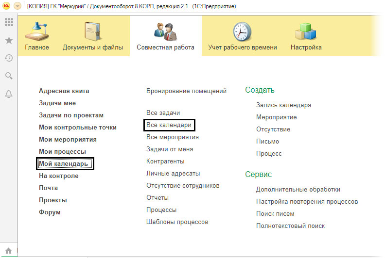 Кроме изменений календаря можно еще и настраивать мероприятия в разделах "Совместная работа" и "Главное".