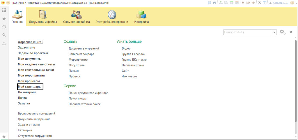 Календарь также можно открыть в разделах "Главное" или "Совместная работа".