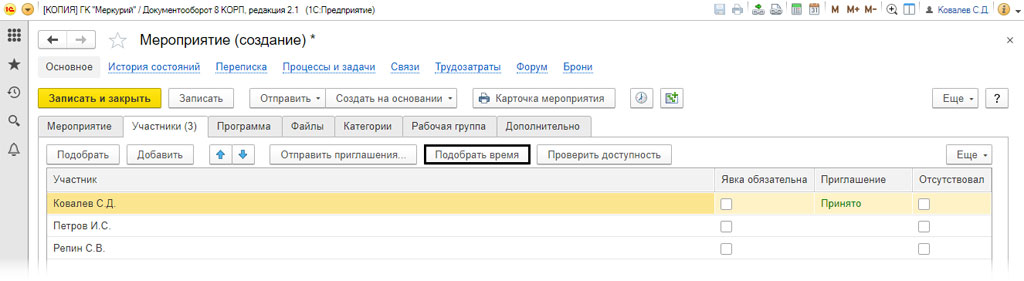 При создании мероприятия программа сможет подобрать наиболее удобное для всех сотрудников время.