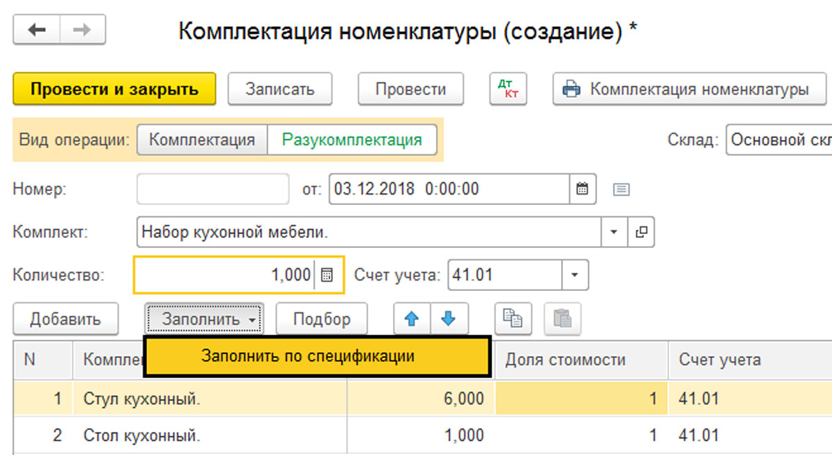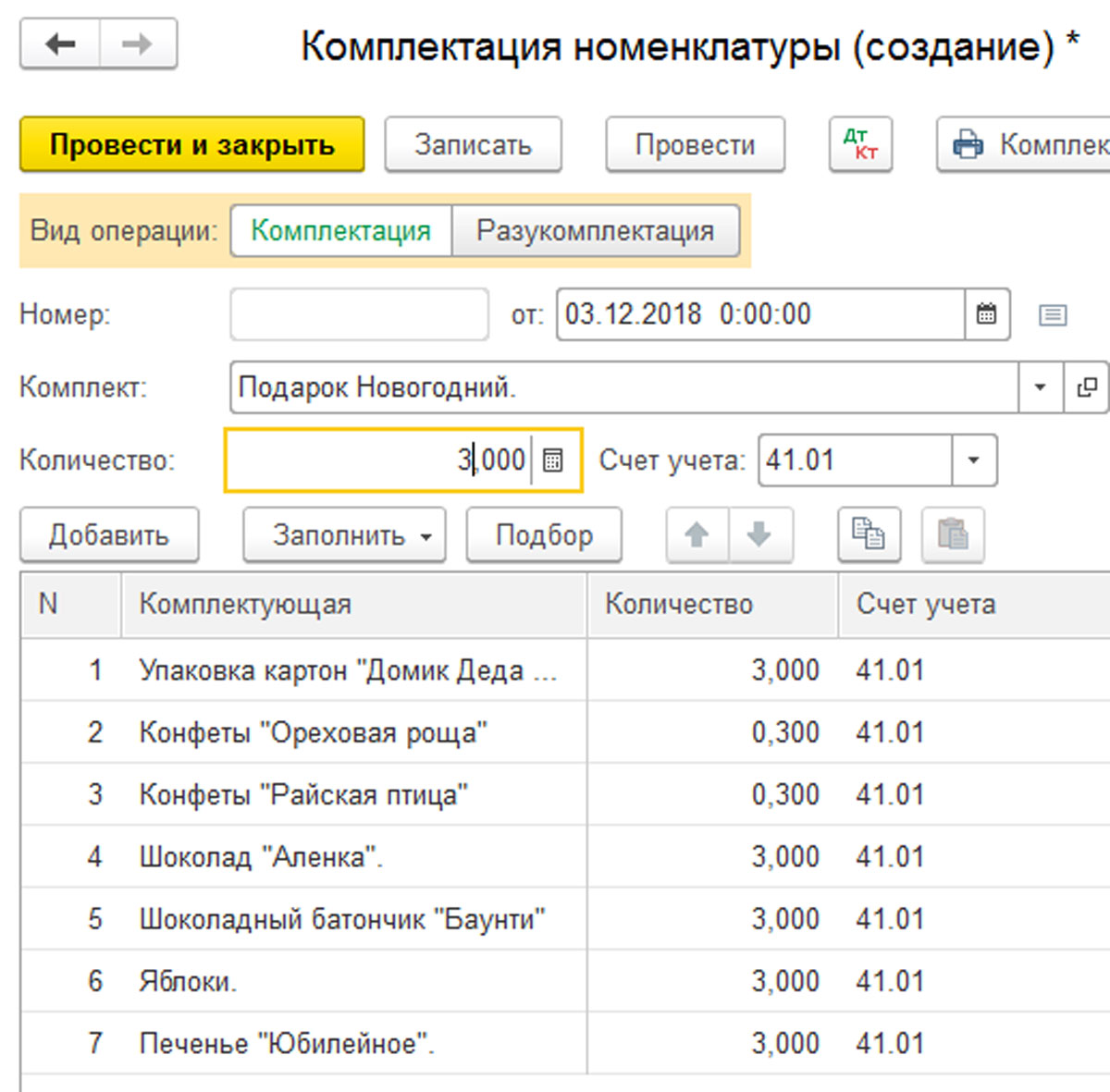 Заполняем документ "Комплектация" в соответствии с операцией "Декомплектация". К примеру, не все позиции "Подарка новогоднего" были реализованы, и теперь необходимо разобрать этот комплект по частям. После нажатия на кнопку "Заполнить" наблюдаем за заполнением таблицы в соответствии нашим нормативам.
