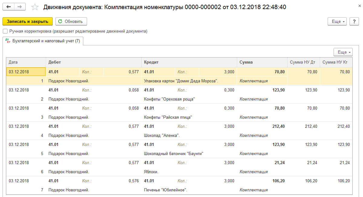 Щёлкаем на пункт" Провести и закрыть", после чего наблюдаем за списанием наших комплектующих, полотенец и прихватки, из которых были получены 5 подарочных наборов. Нажимаем «Показать проводки и другие движения документа» и видим: