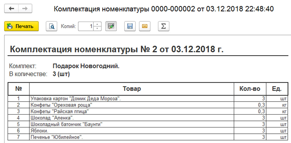 "Комплектация Номенклатуры" в печатной форме выводит содержание нашего комплекта.