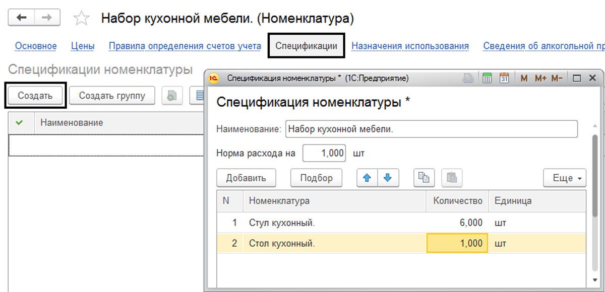 В качестве нового примера представим следующую ситуацию: поставщик отправил в торговую сеть комплект кухонной мебели, включающий в себя стол и шесть стульев, но покупателю не нужен стол из этого набора. В программе и на бумаге номенклатура позиция представлена в качестве комплекта мебели, поэтому перед продажей требуется провести декомплектацию. Чтобы упростить задачу, указываем детали — состав набора в разделе "Спецификация".