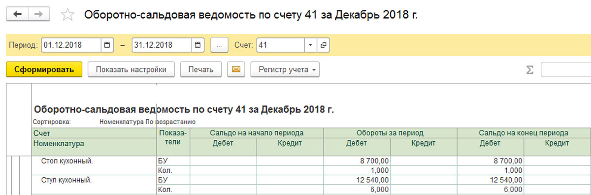 Займёмся "Оборотной-сальдовой ведомостью по счету 41 - Товары" (выбираем в меню "Отчеты-Стандартные-Оборотно-сальдовая ведомость по счету"). На остатках появятся созданные нами номенклатуры "Набор подарочный" и "Подарок новогодний".