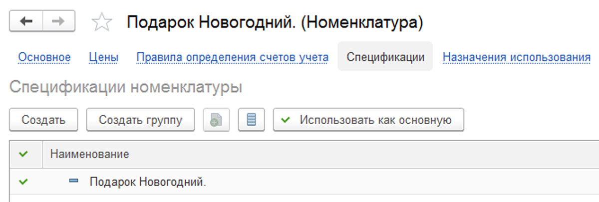 Заполнение спецификации требуется, если комплект имеет внушительные размеры. С этой целью в справочник "Номенклатура" включён раздел "Спецификация", в котором содержится информация о нормативном составе товара или комплекта. Создадим новую номенклатурную позицию и назовём её "Подарок Новогодний". Для этого переходим по гиперссылке "Спецификация" и щелкаем на кнопку "Создать". Далее указываем список включённых в набор товаров через кнопки "Добавить" или "Подбор".