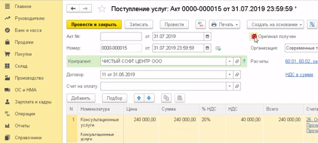 Допустим организация получает от исполнителя услуги, оригиналы документов, оформленные надлежащим образом. При регистрации документа поступления, установим флаг - оригинал получен.