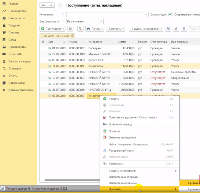 Загруженные из электронной почты документы не являются юридически значимыми, поэтому при регистрации документа поступления, флаг оригинал получен не устанавливаем. До тех пор, пока от поставщика не придут оригиналы надлежащие оформленных документов. Предположим, что от поставщика пришли оригиналы документов, в том числе документы за прошлый период, закрытый для редактирования. Установить признак оригинала можно не только из формы документа поступления, но также из формы списка документов поступления. Выделим документы в которых нужно поменять статус. Выбираем команду - оригинал получен.