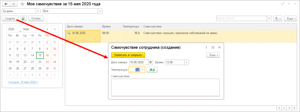 2. Кликнуть на кнопку Создать. Если температура тела соответствует норме, кликнуть на клавишу 36,6. Система передаст информацию автоматически.