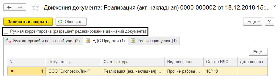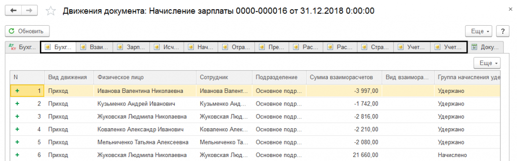 Изучить движение по регистрам возможно с помощью активации функции «Показать проводки и другие движения по регистрам». Эта функция доступна в любом журнале документов.