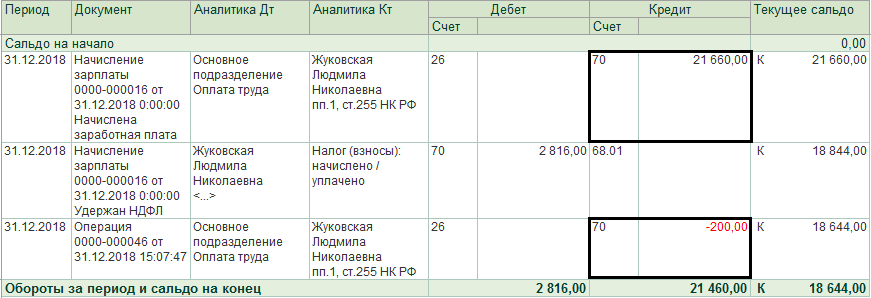 В сформированном отчете по сотруднику «Карточка счета» (вкладка «Отчеты» - «Стандартные») явно видно, как прошла измененная бухгалтерская проводка. Снижение на двести рублей дает изменение в сумме начисленной заработной платы (21660-200=21460).