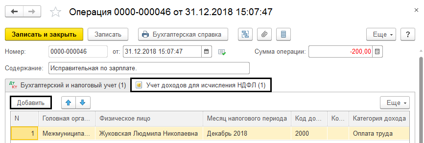 Пока в общих оборотах расхождений не видно. Для контроля сформируем отчет в налоговую по форме 2-НДФЛ (вкладка «Отчеты» - «Регламентированные отчеты»). В отчете сумма за декабрь не изменилась. Это следствие того, что не были созданы движения по регистрам, которые нужны для составления отчетов. В отчеты наша операция изменения не внесла.