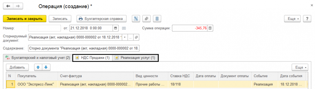 В рабочем документе «Операция» возникнет еще одна вкладка, содержащая название выбранного регистра. Во вкладке пользователь добавляет запись дополнив ее необходимой информацией.