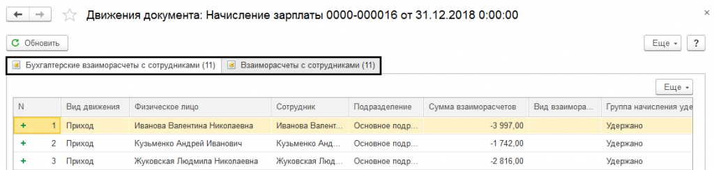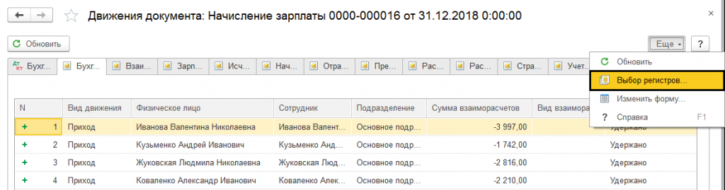 Проведем изменения в регистре с помощью функции «Операция». В процессе формирования ведомостей по заработной плате используется несколько регистров, в примере мы исследуем изменение одного.