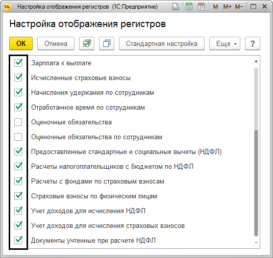 В случае, если регистров много, пользователь может отобрать нужные, активировав функцию «Еще» - команда «Выбор регистров».