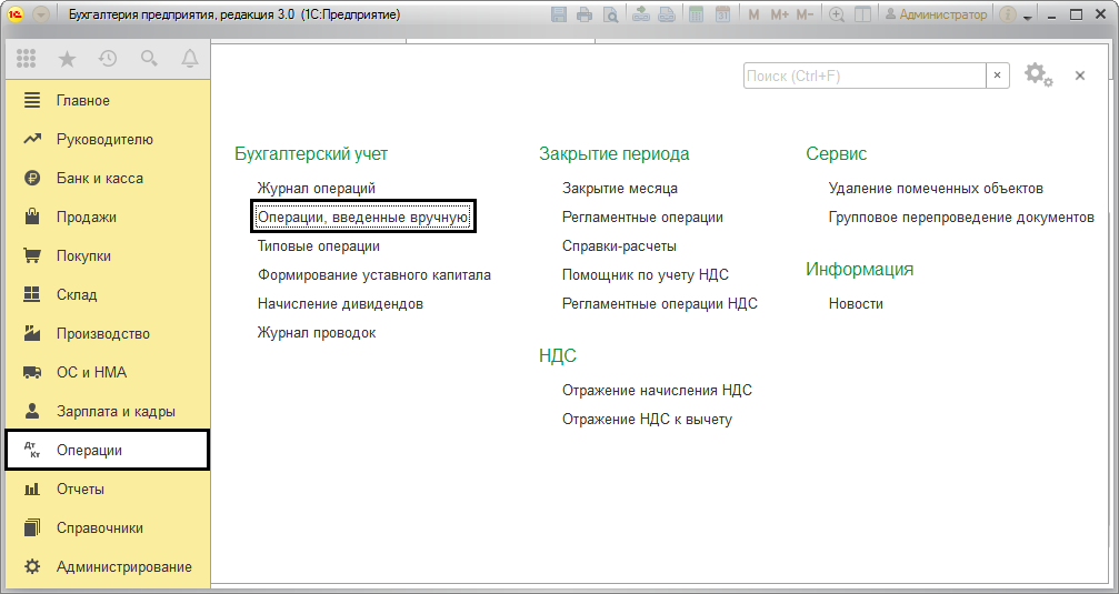Посмотрим журнал «Операции, введенные вручную» из вкладки «Операции».