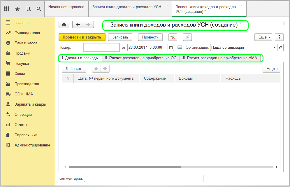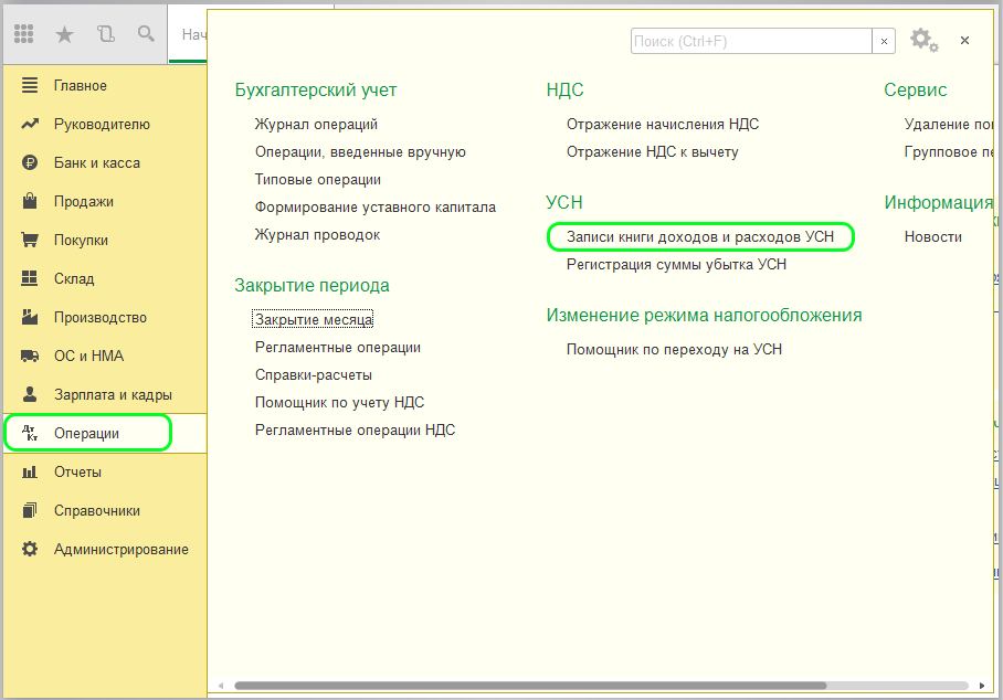 Возможна ситуация, когда пользователю нужно исправить сведения для формирования правильной КУДиР. Для этого используется документ "Запись книги доходов и расходов УСН", который находится в разделе "Операции" и далее в "УСН".