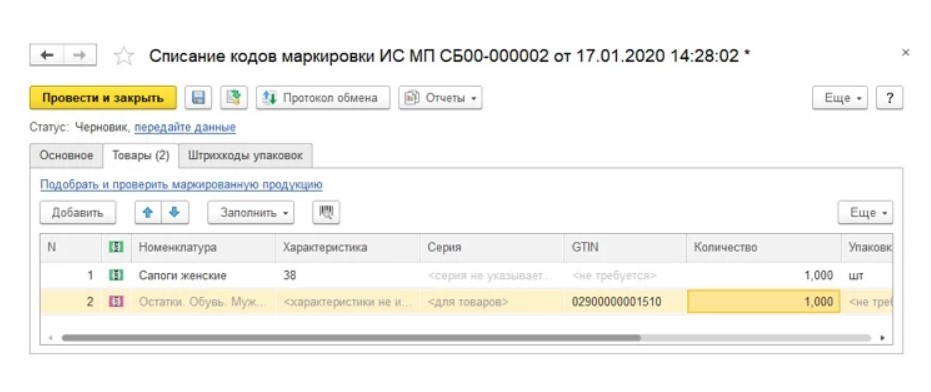 Далее нужно нажать «Провести и закрыть», а потом в разделе «Обмен с ИС МП» нажать строку с названием «Маркировка товаров ИС МП».