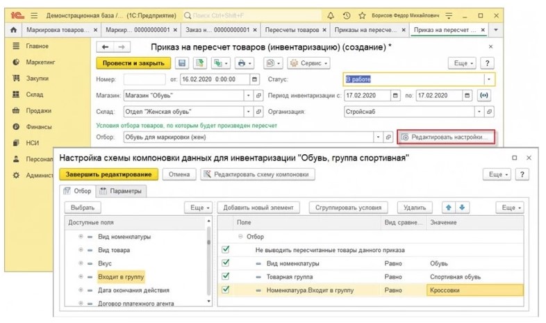 Абсолютно для каждой группы и категории необходимо получить международный уникальный код GTIN. Однако те, у кого программа была установлена до введения специальной маркировки на обувную продукцию, в обязательном порядке следует войти в опцию “Склад” и составить “Приказ на пересчет товаров”. Для каждой точки розничной торговли или складского помещения, необходимо выполнять такую функцию отдельно.