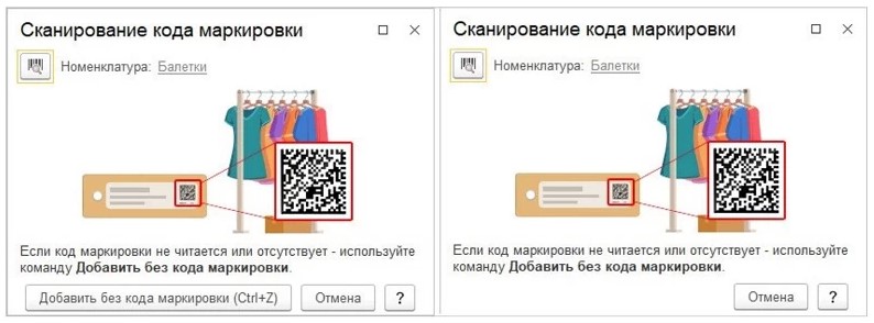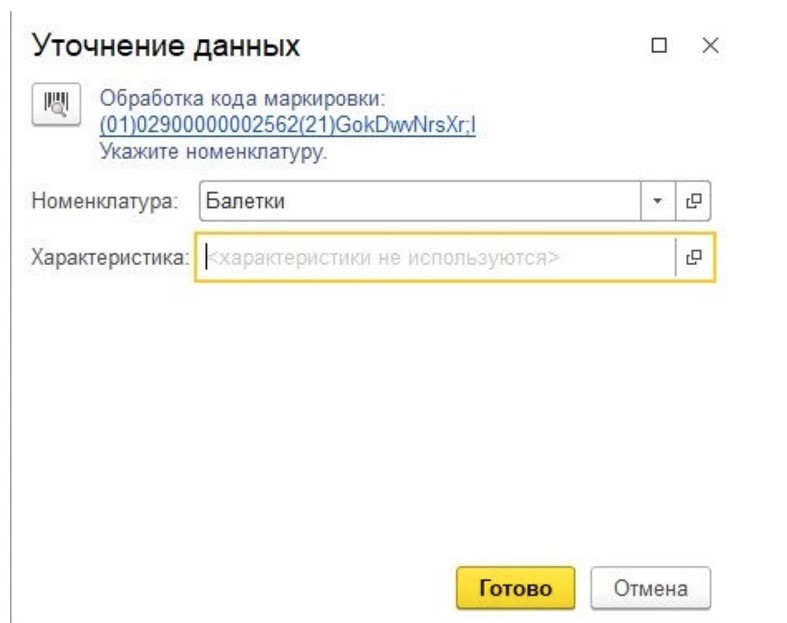 Программа может запросить уточнение номенклатуры в случае присутствия средств идентификации, но только если она эмитирована в ГИС МТ или в “1С Рознице” по названию или сокращенному описанию.