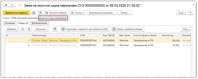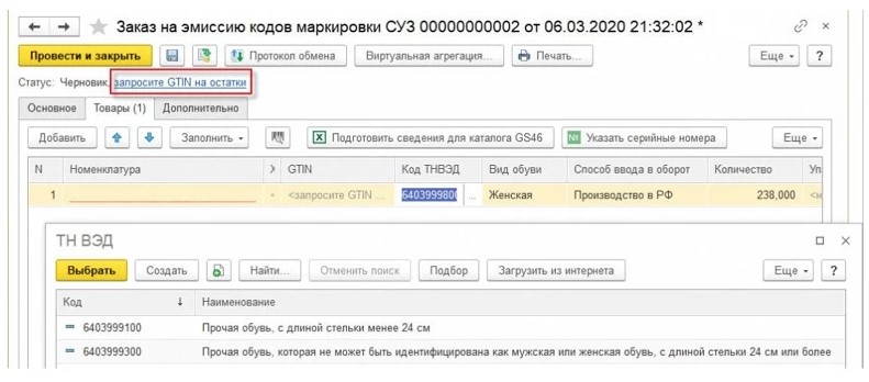 В завершении, с помощью интерфейса программы в ГИС маркировки обуви следует создать запрос на получение GTIN на оставшуюся продукцию.
