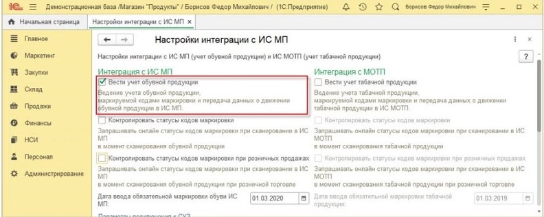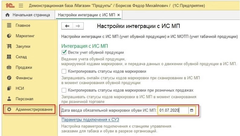 В случае если требуется заказать марки через программу “1С Розница” – то необходимо зайти в раздел “Администрирование” и найти пункт “Настройка интеграции с ИС МП”, после чего поставить отметку рядом с параметром “Вести учет обувной продукции”.