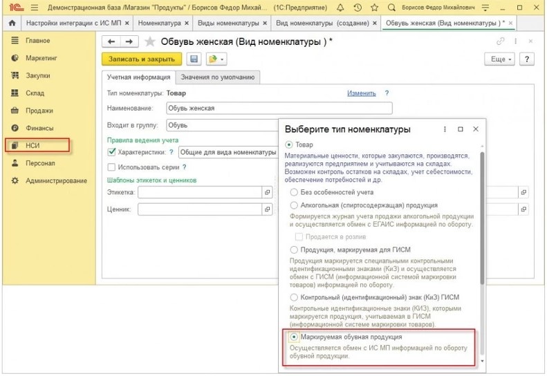 Для того, чтобы программа “1С Розница” отметила, что обувь является промаркированной, следует указать это ответив специальный тип номенклатуры для каждого раздела обувного товара.