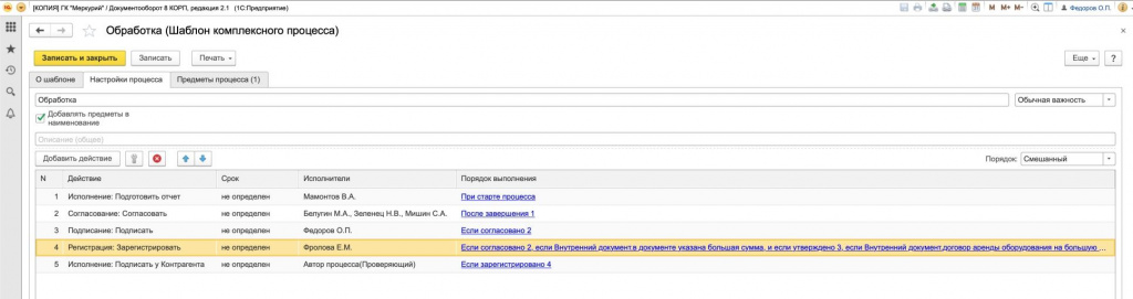 Используя различные условия внутри несложных процессов в ходе выполнения различных действий, задавая сложные условия маршрутизации различными способами (на встроенном языке, комбинированные варианты), можно сконструировать сложнейшие, многоуровневые бизнес-процессы для обработки и согласования документов, контрагентов и прочего.