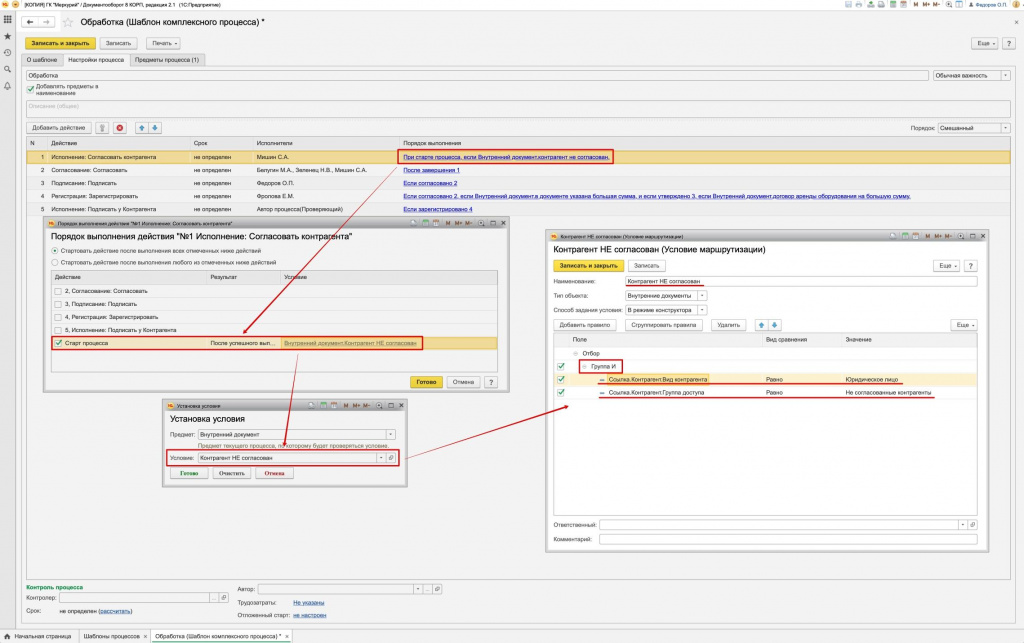 Например, в нашем примере с контрагентом обязательно нужно предусмотреть модель условия, где контрагент согласован, а начальный этап с согласованием из-за этого не запустится. Поэтому, чтобы процесс не выдал ошибку, то вторым этапом нужно включить в условие при старте – Контрагент согласован.